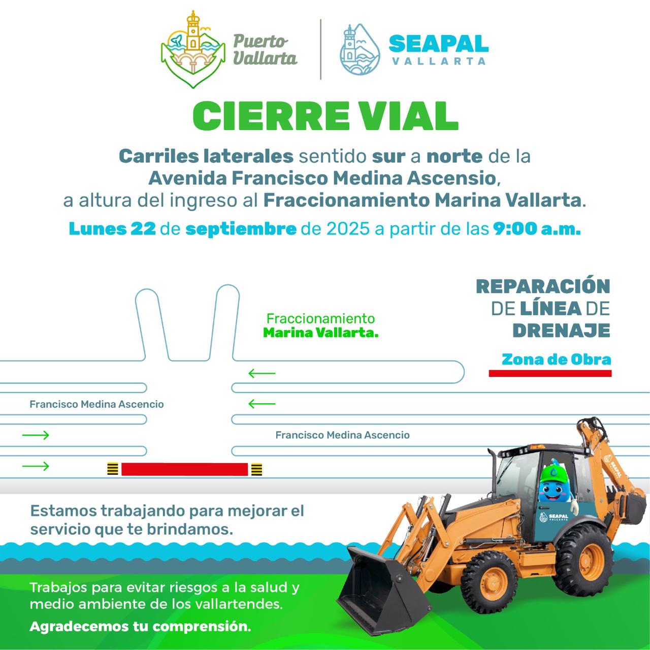 Las labores se desarrollarán en los carriles laterales de la Avenida Francisco Medina Ascencio, en sentido sur a norte, a la altura del ingreso al Fraccionamiento Marina Vallarta,por este motivo, se implementará un cierre a la circulación vehicular en la zona.
