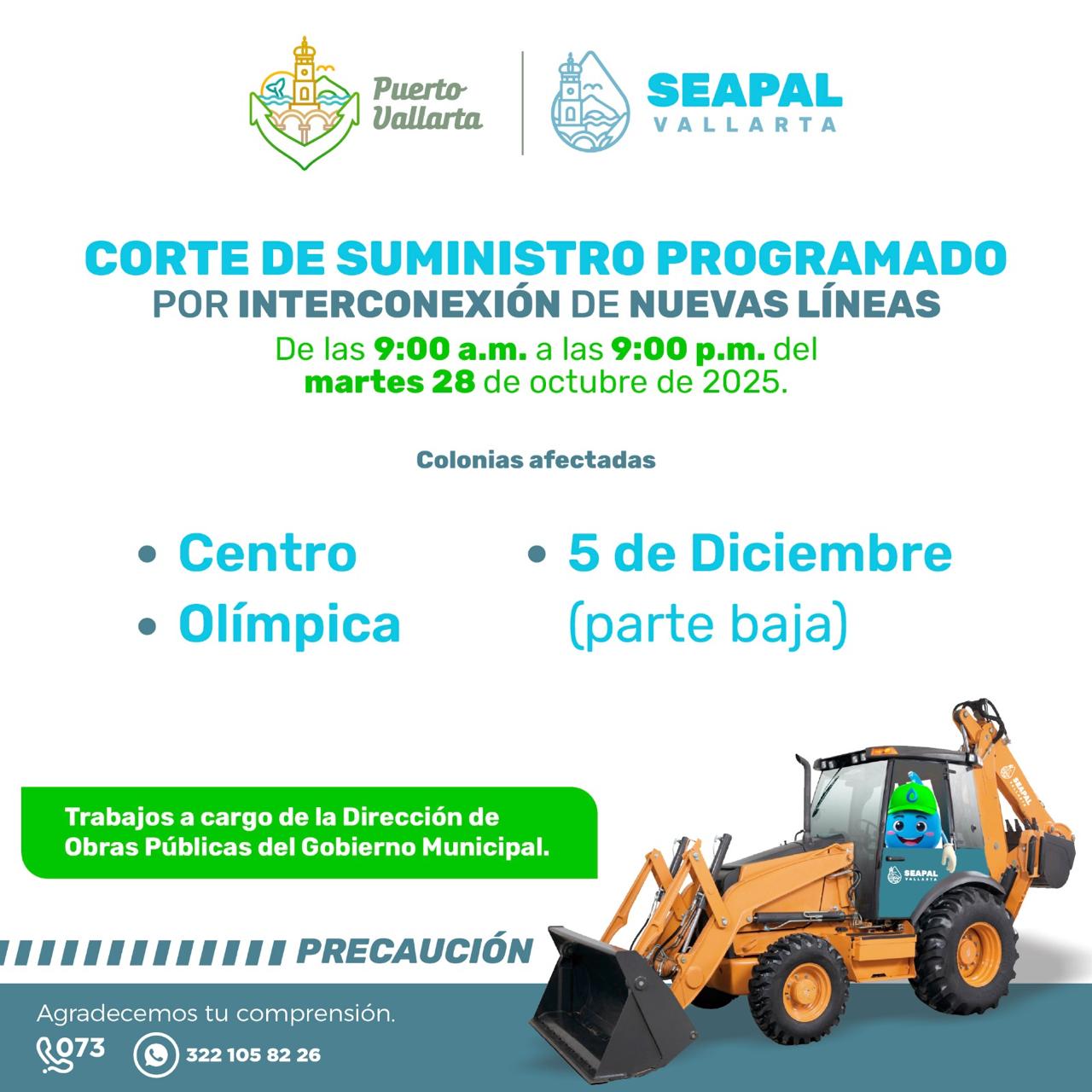 En el marco de las obras de rehabilitación que realiza el Gobierno Municipal de Puerto Vallarta en la avenida México, este martes 28 de octubre, se llevará a cabo un corte temporal en el suministro de agua potable en las colonias Centro, 5 de Diciembre parte baja y Olímpica de 9:00 a.m. a 9:00 p.m.